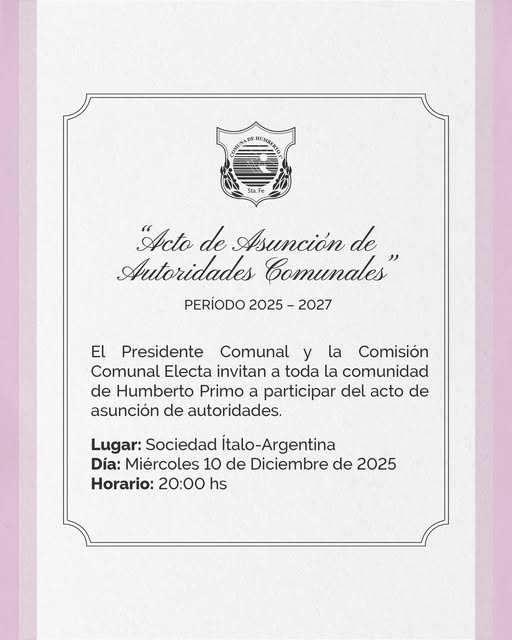 El Presidente Comunal de Humberto Primo, Sr. Mauro Gilabert, junto a la Comisión Comunal Electa, invita a toda la comunidad a participar del Acto de Asunción de Autoridades Comunales – Período 2025–2027, un acontecimiento fundamental para la vida institucional de nuestro pueblo.